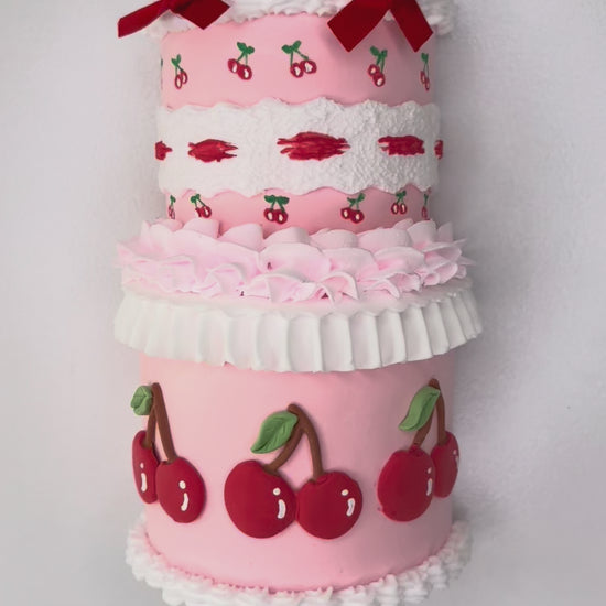 - Top tier: Decorated with hand painted miniature cherry prints, fluffy faux frosting, red bows, and topped with a large faux cherry and a pink piped cream swirl.