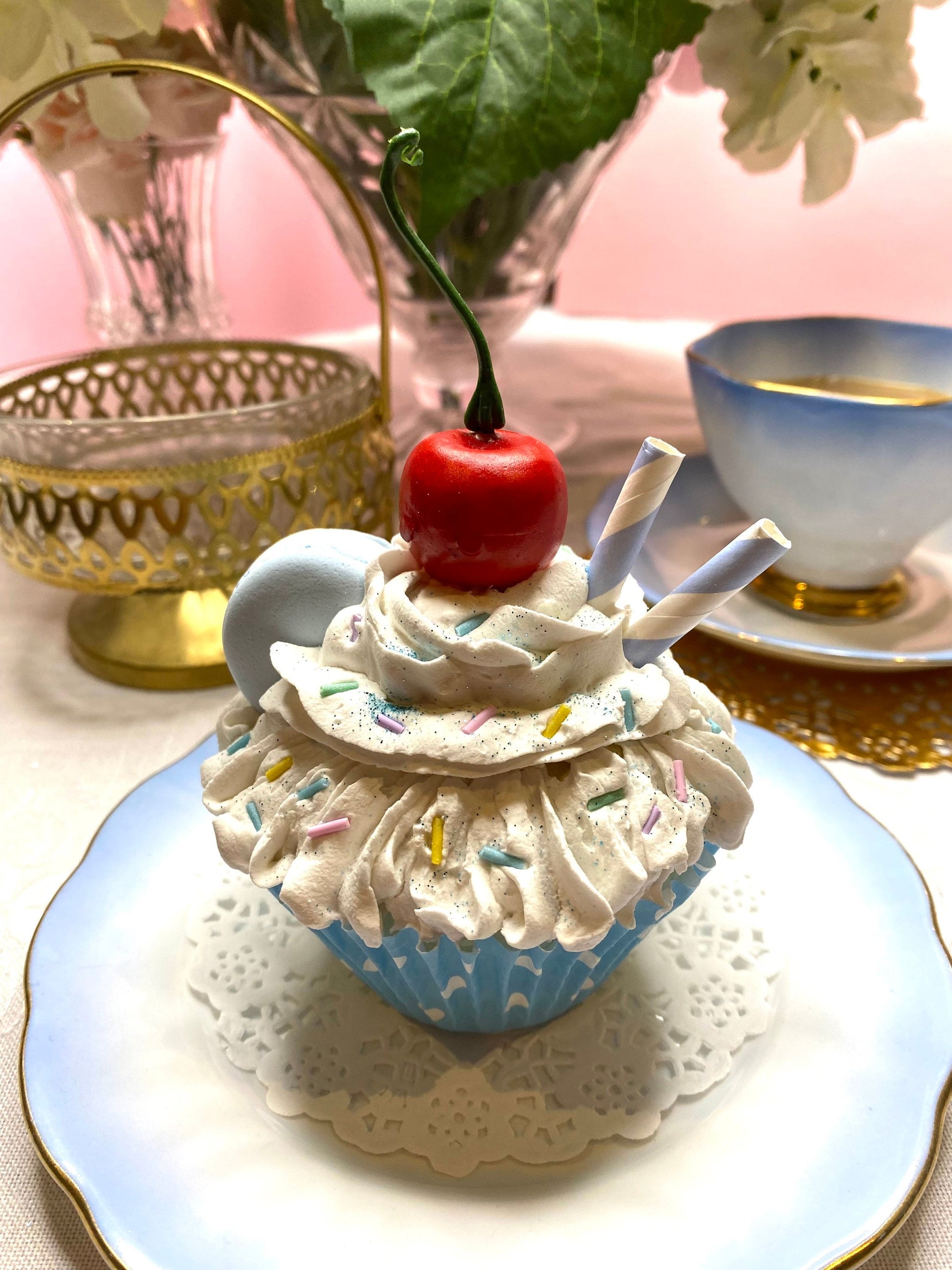 These fake handmade cup cake would make a perfect display item in a kitchen, on a tiered tray, or as a photo prop.