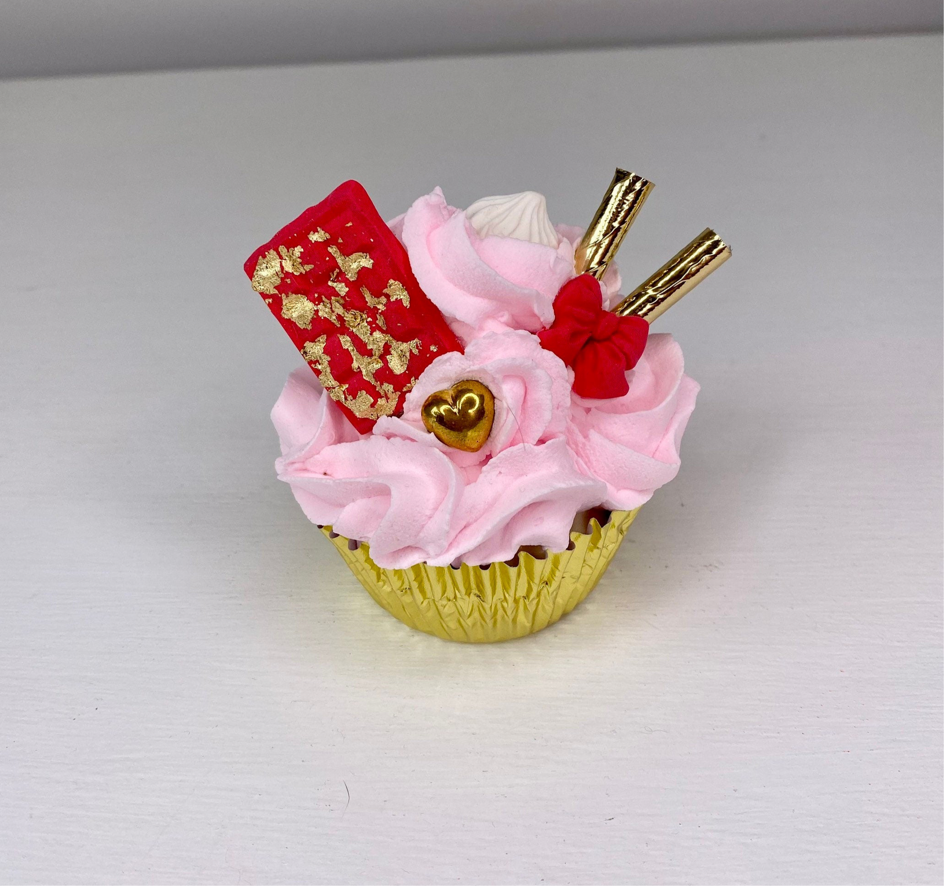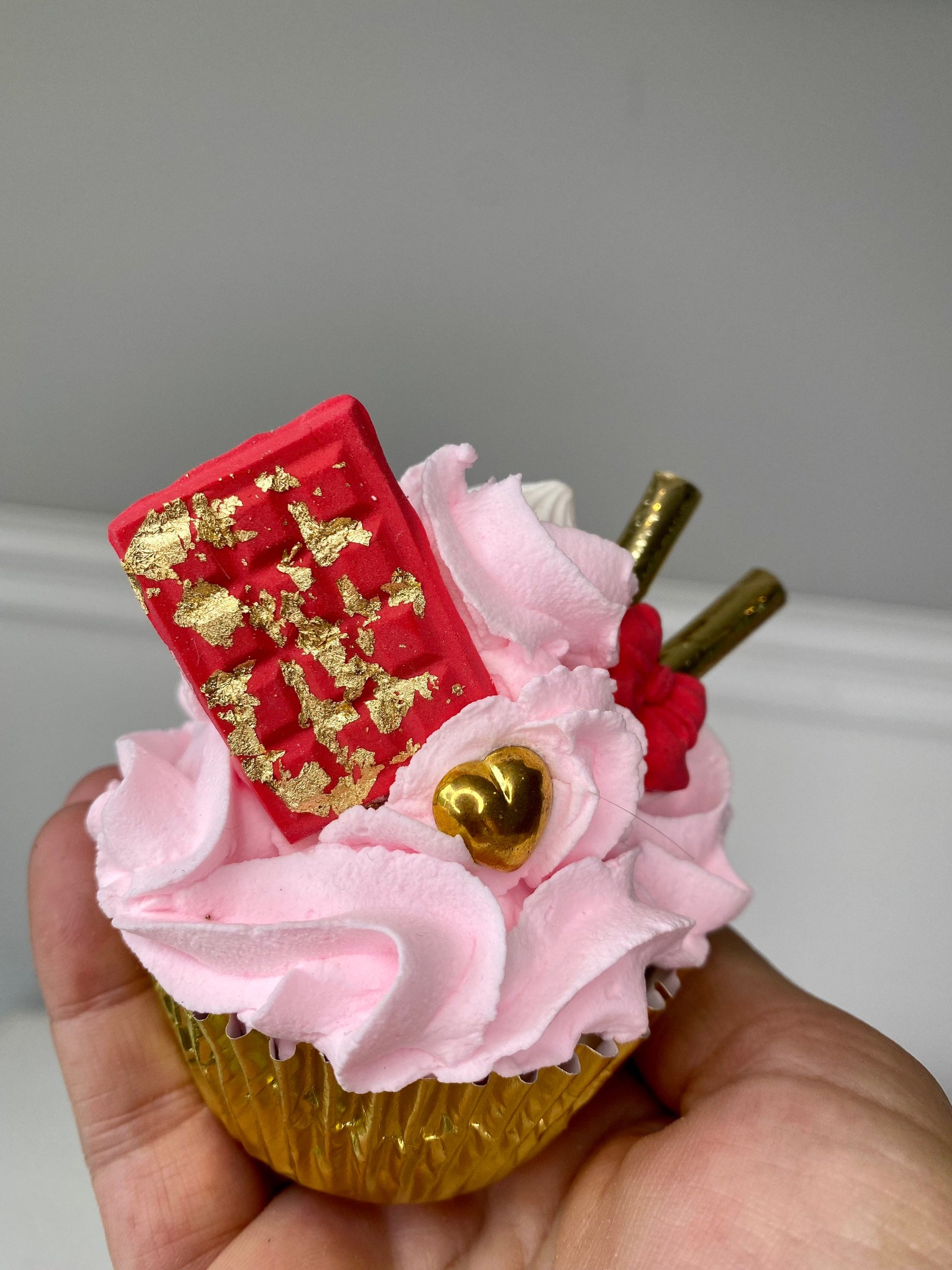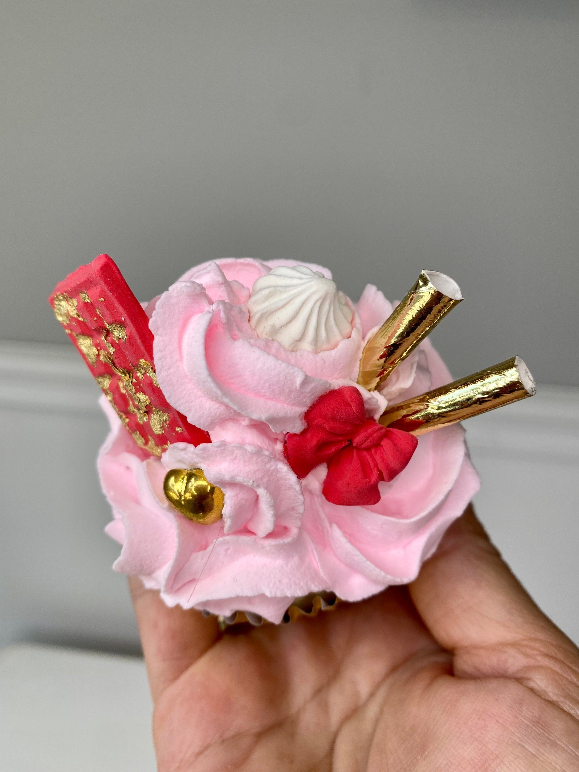 Handmade in a luxe gold patty case, this pretend cupcake is topped with soft pink faux icing and embellished with a mix of red, white, and gold accents—adding just the right amount of sparkle and charm. ✨