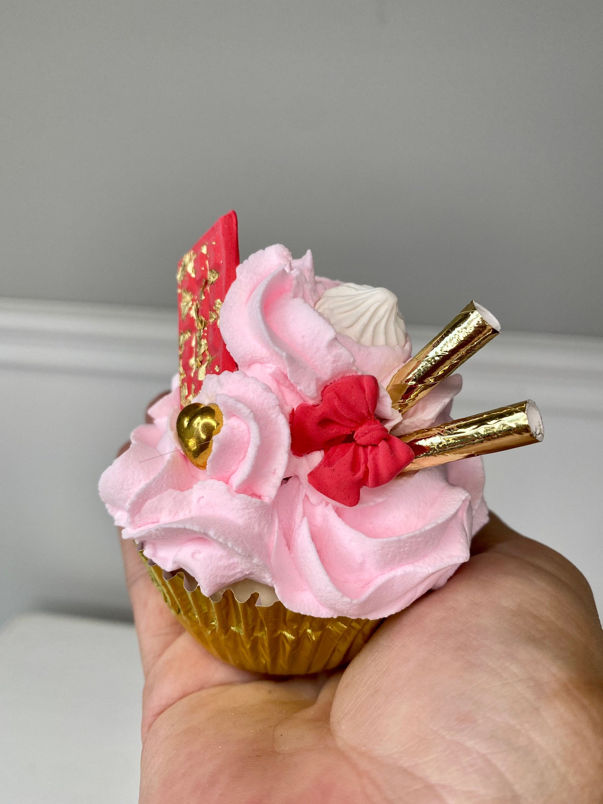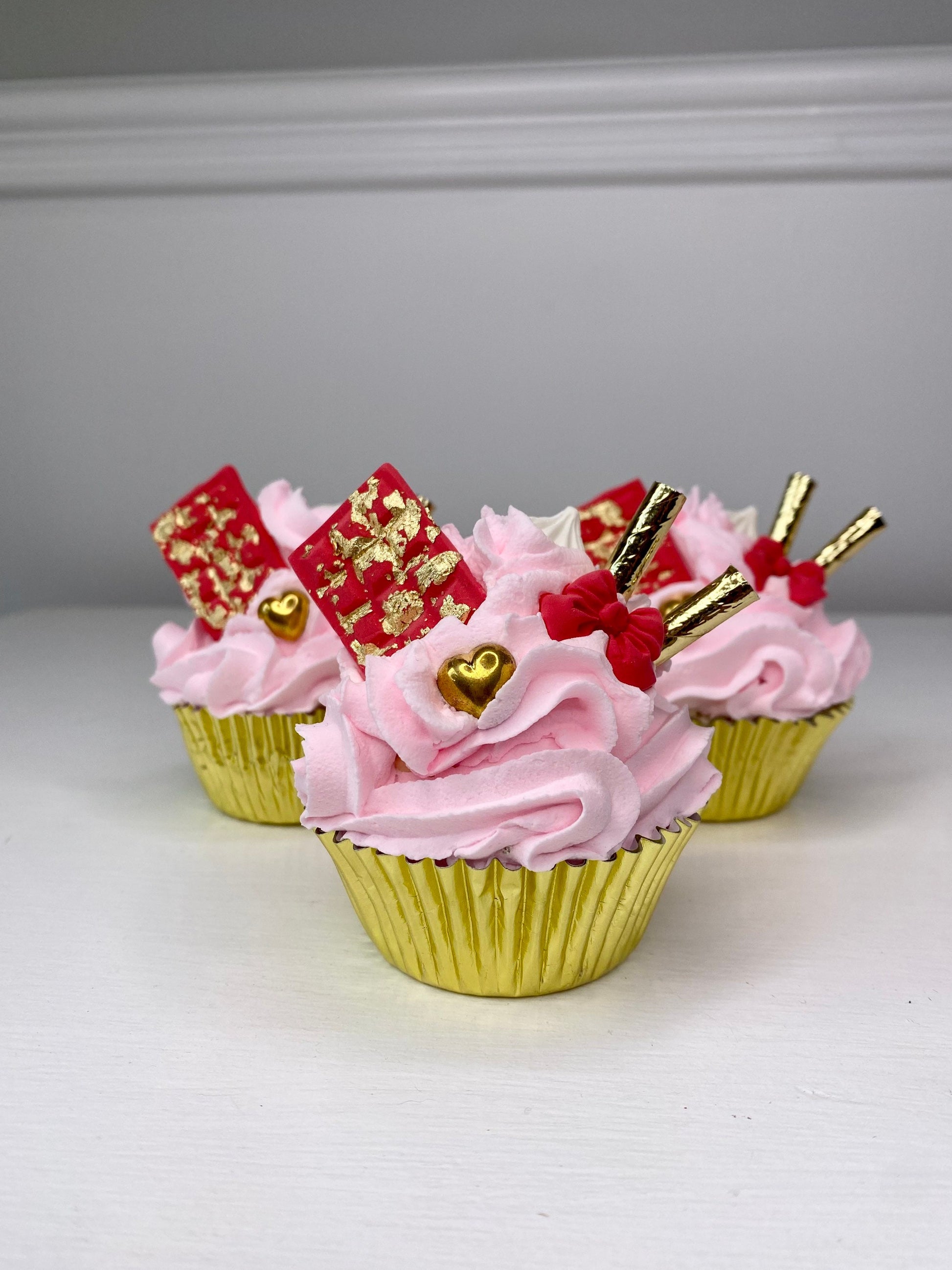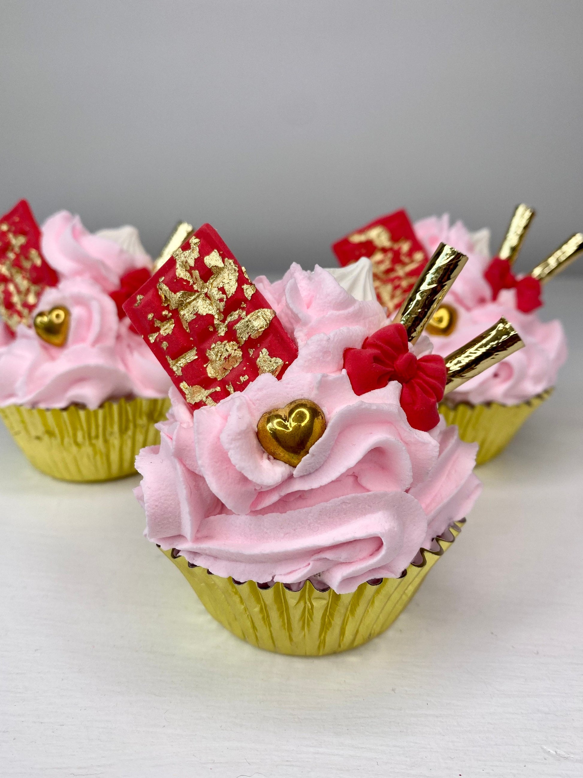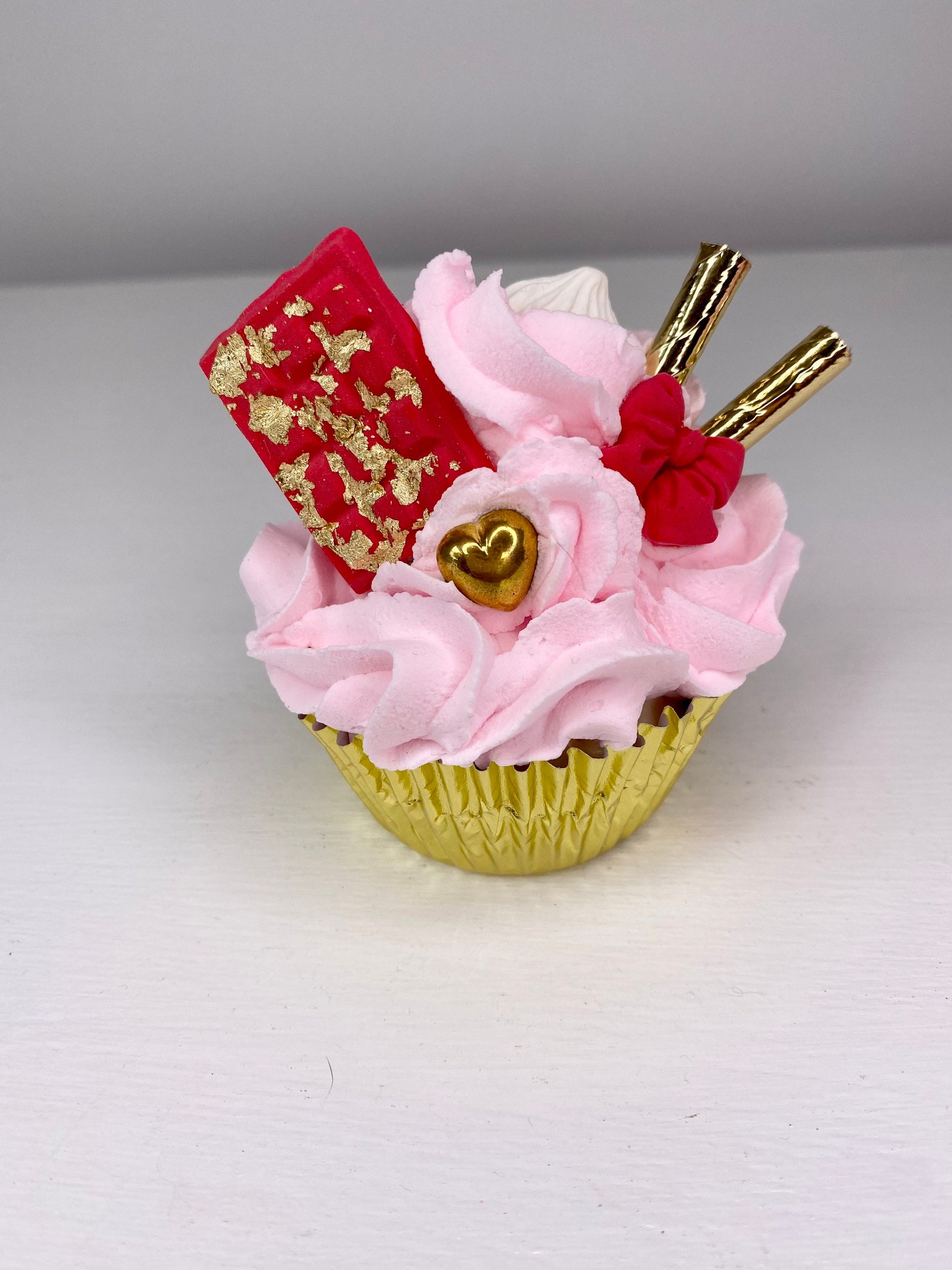 Handmade in a luxe gold patty case, this pretend cupcake is topped with soft pink faux icing and embellished with a mix of red, white, and gold accents—adding just the right amount of sparkle and charm. ✨