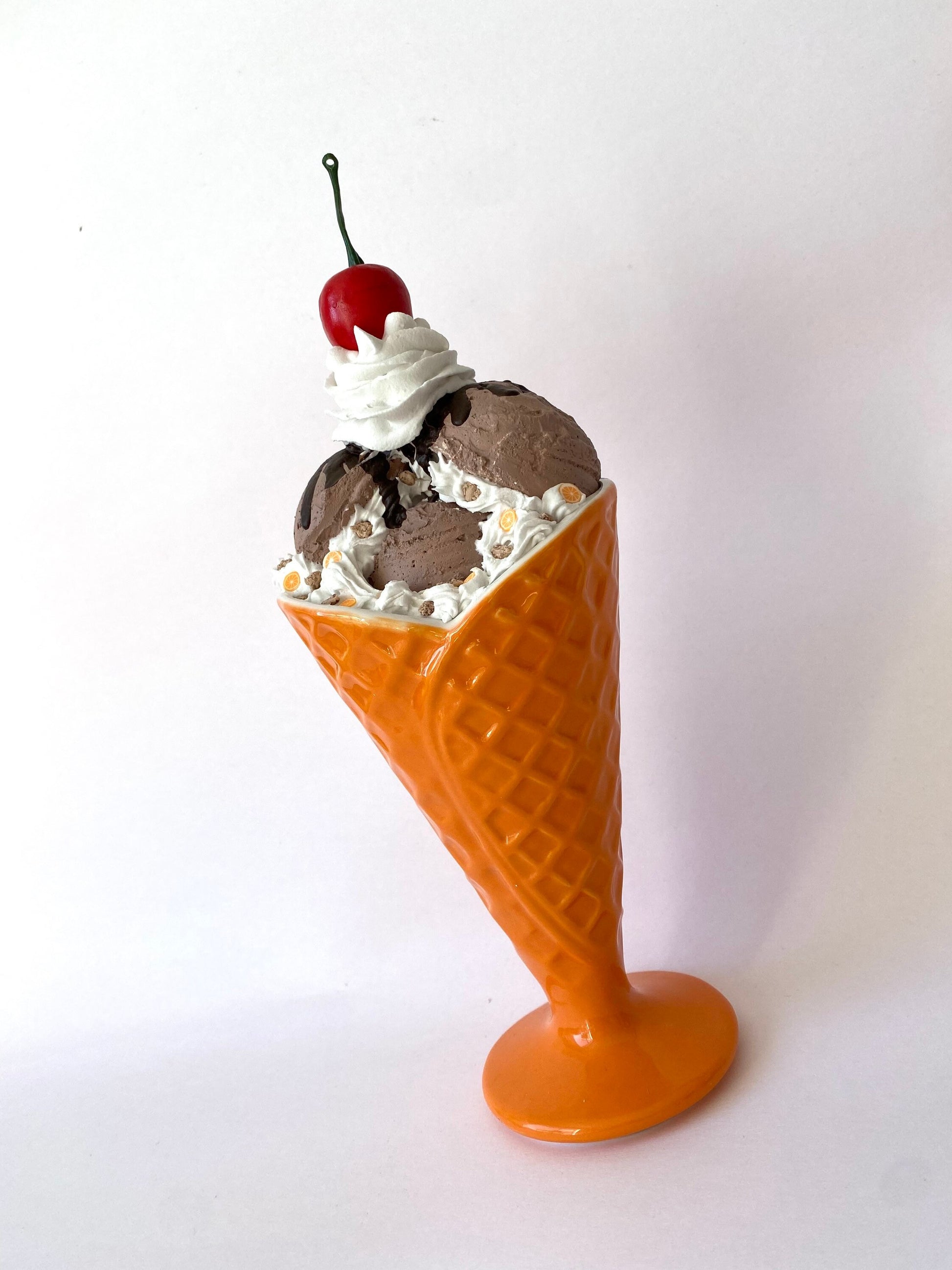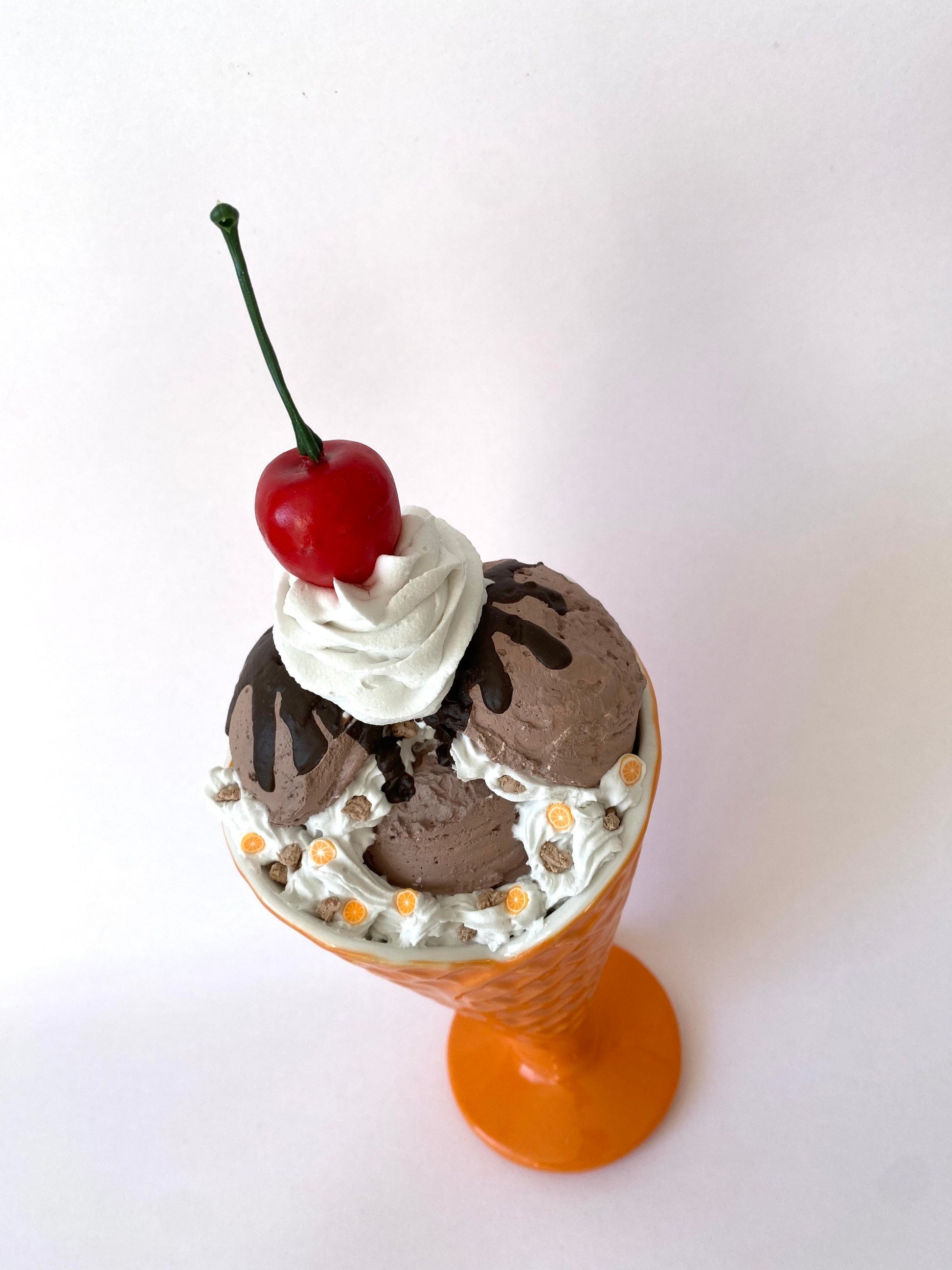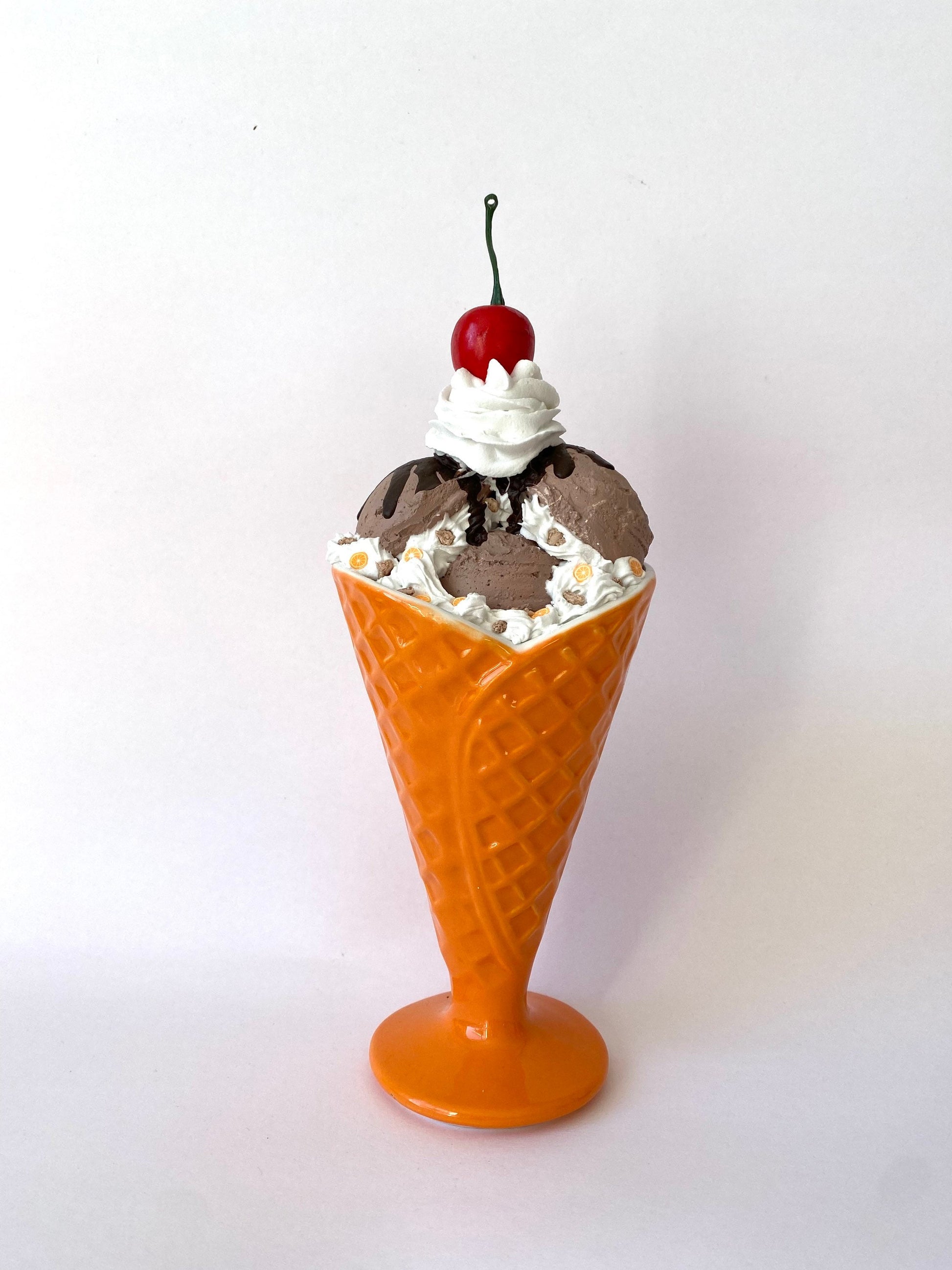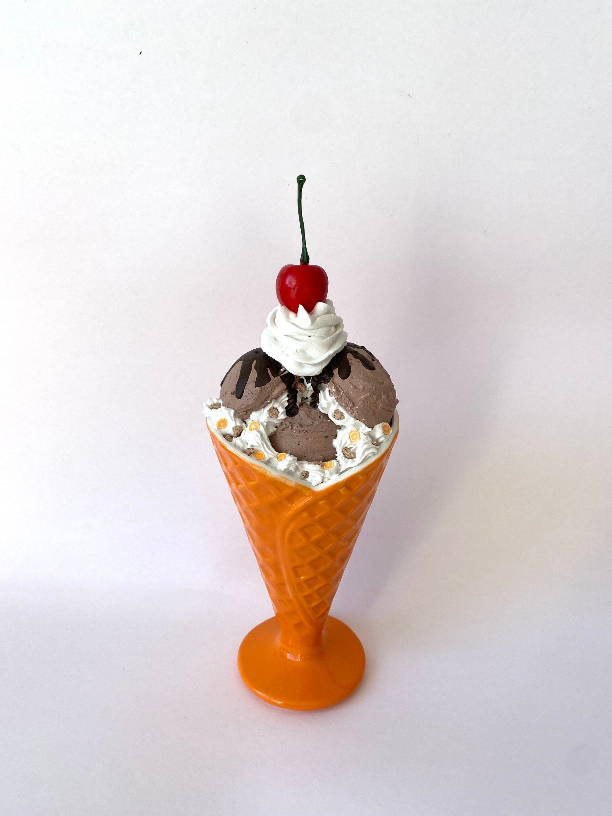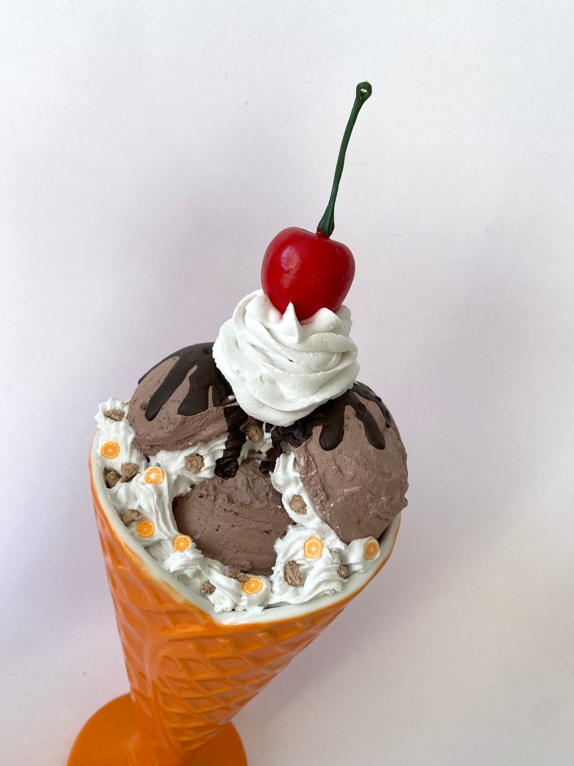 Featuring three rich chocolate faux ice cream scoops, artfully displayed in a vibrant orange ceramic sundae holder, this eye-catching piece is finished with fake icing, faux chocolate drizzle, colourful sprinkles, and topped with a cherry on top.