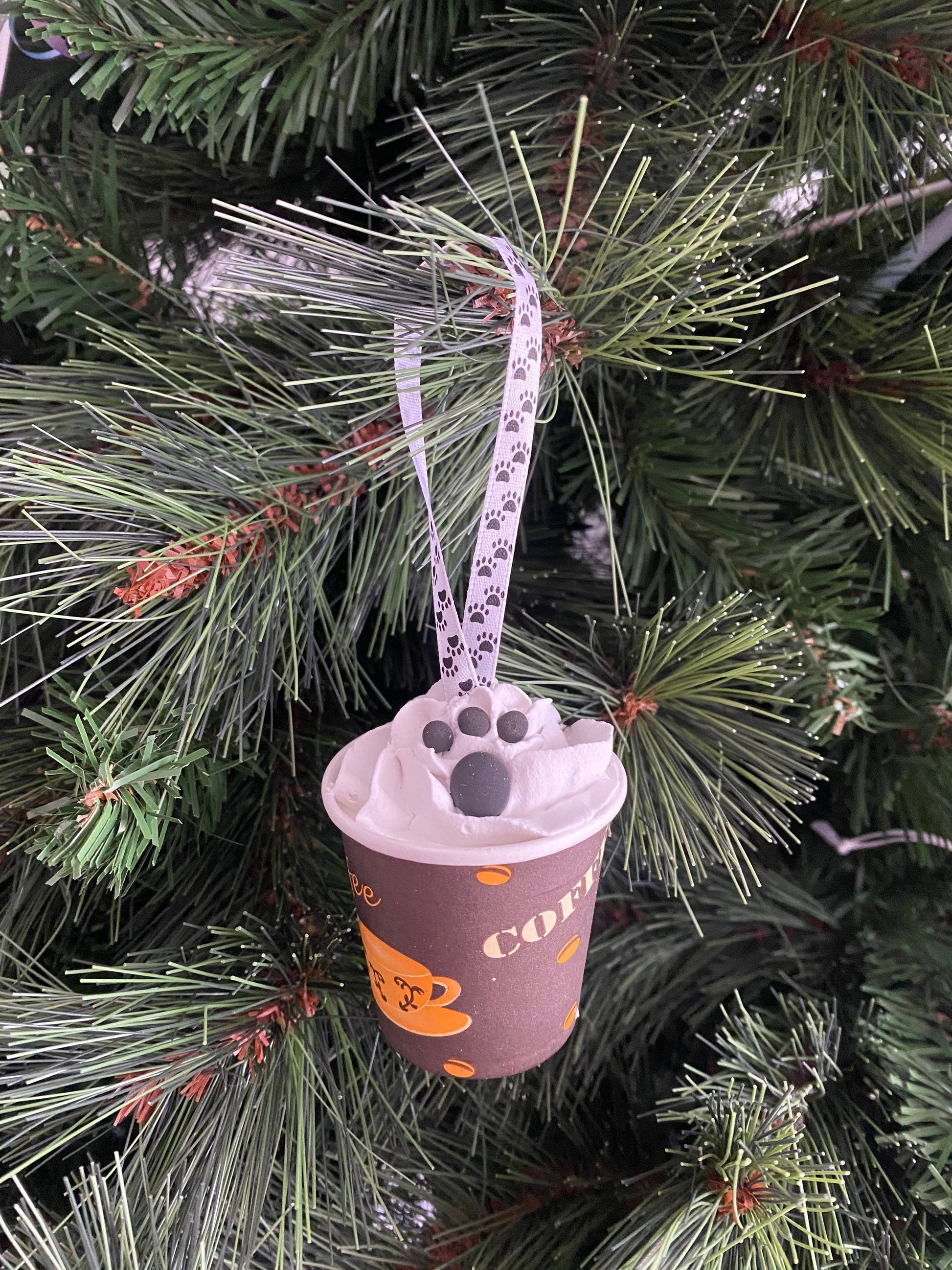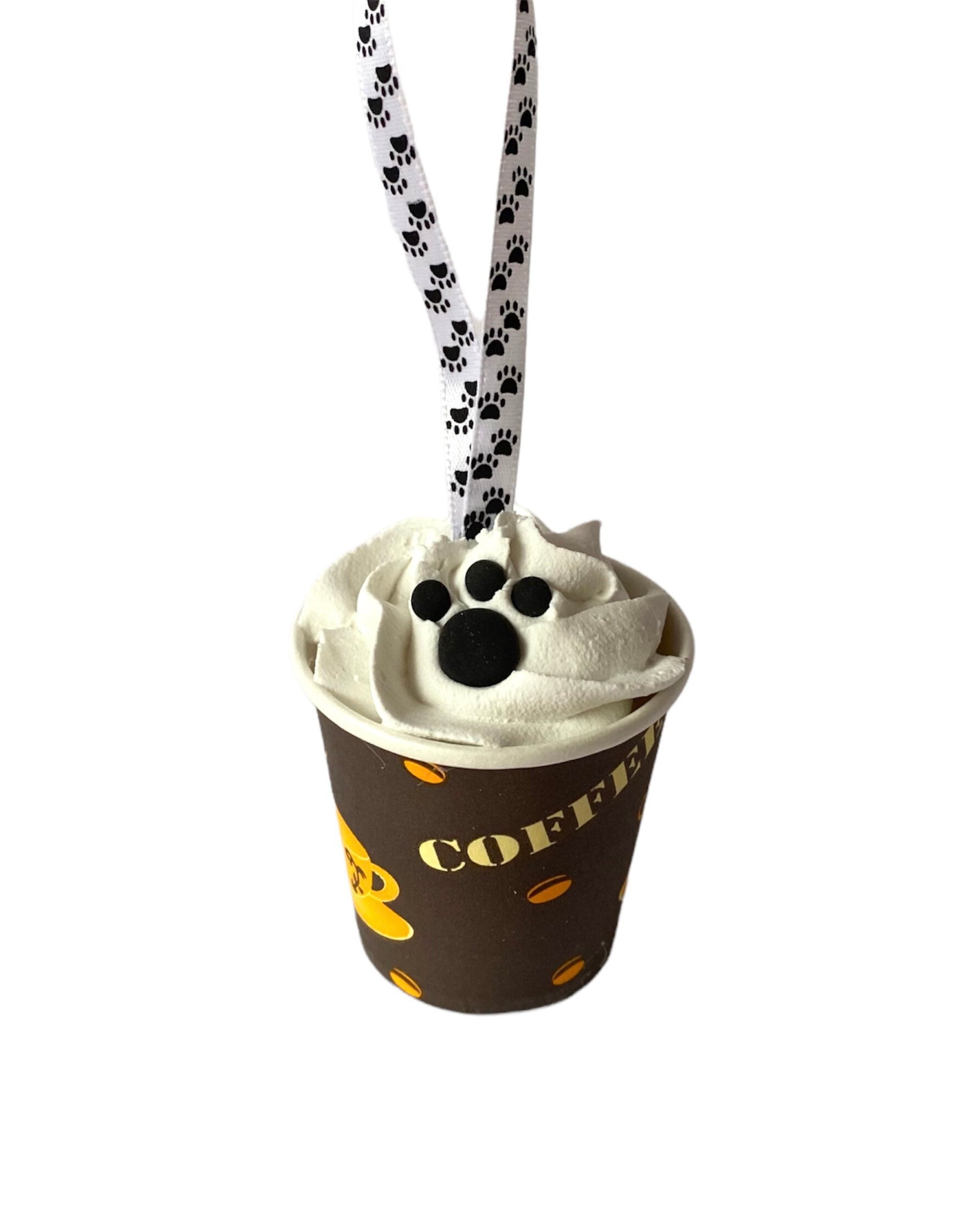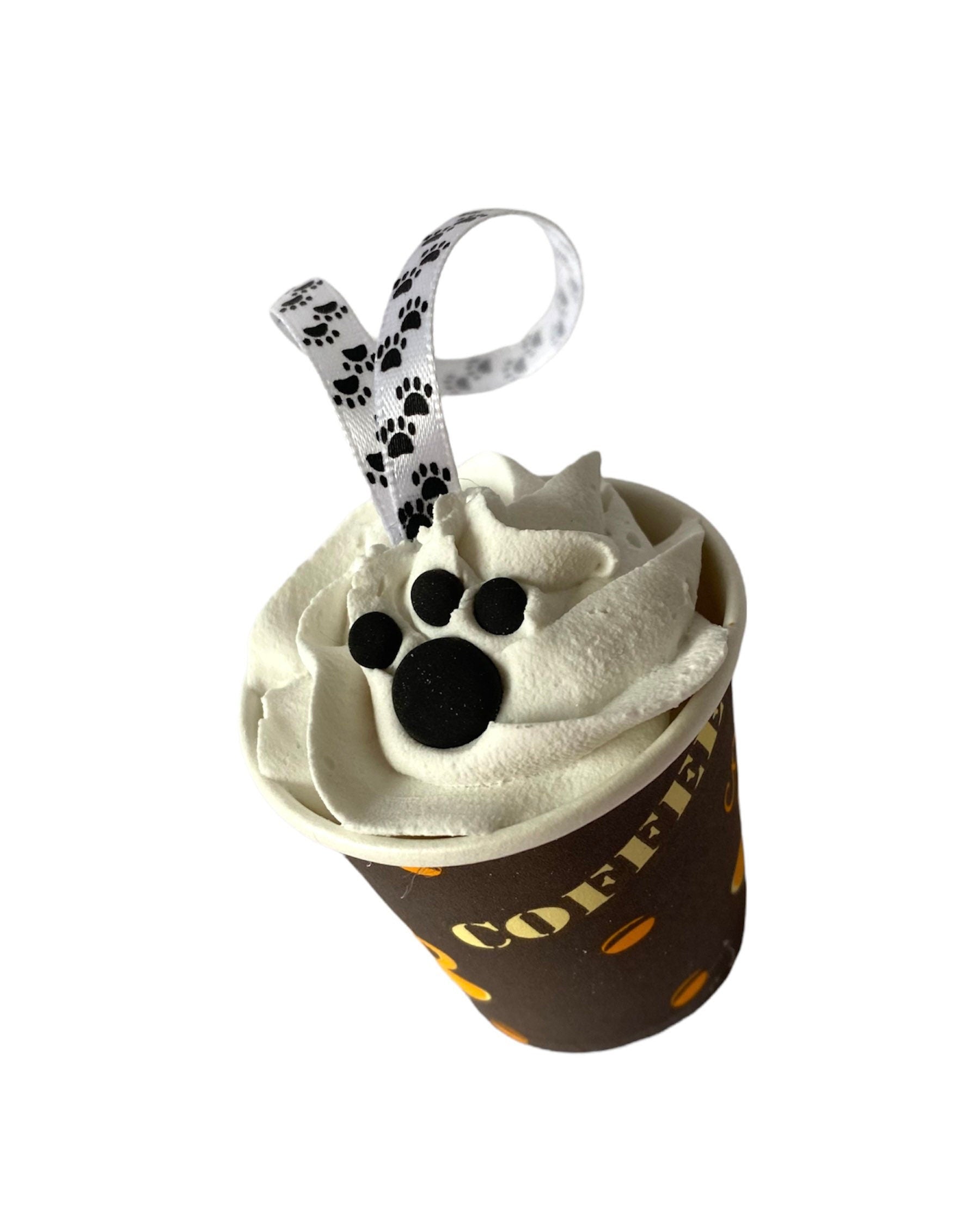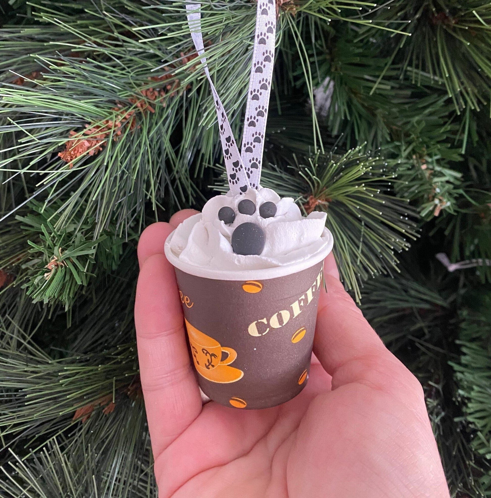 Each ornament is lovingly handcrafted with attention to detail, featuring a mini âpuppuccino,â a tiny paw print, and a coordinating paw-print ribbon. Whether you're decorating your Christmas tree, a tiered tray, or styling a dog-themed holiday display, this piece adds a playful and unique touch.