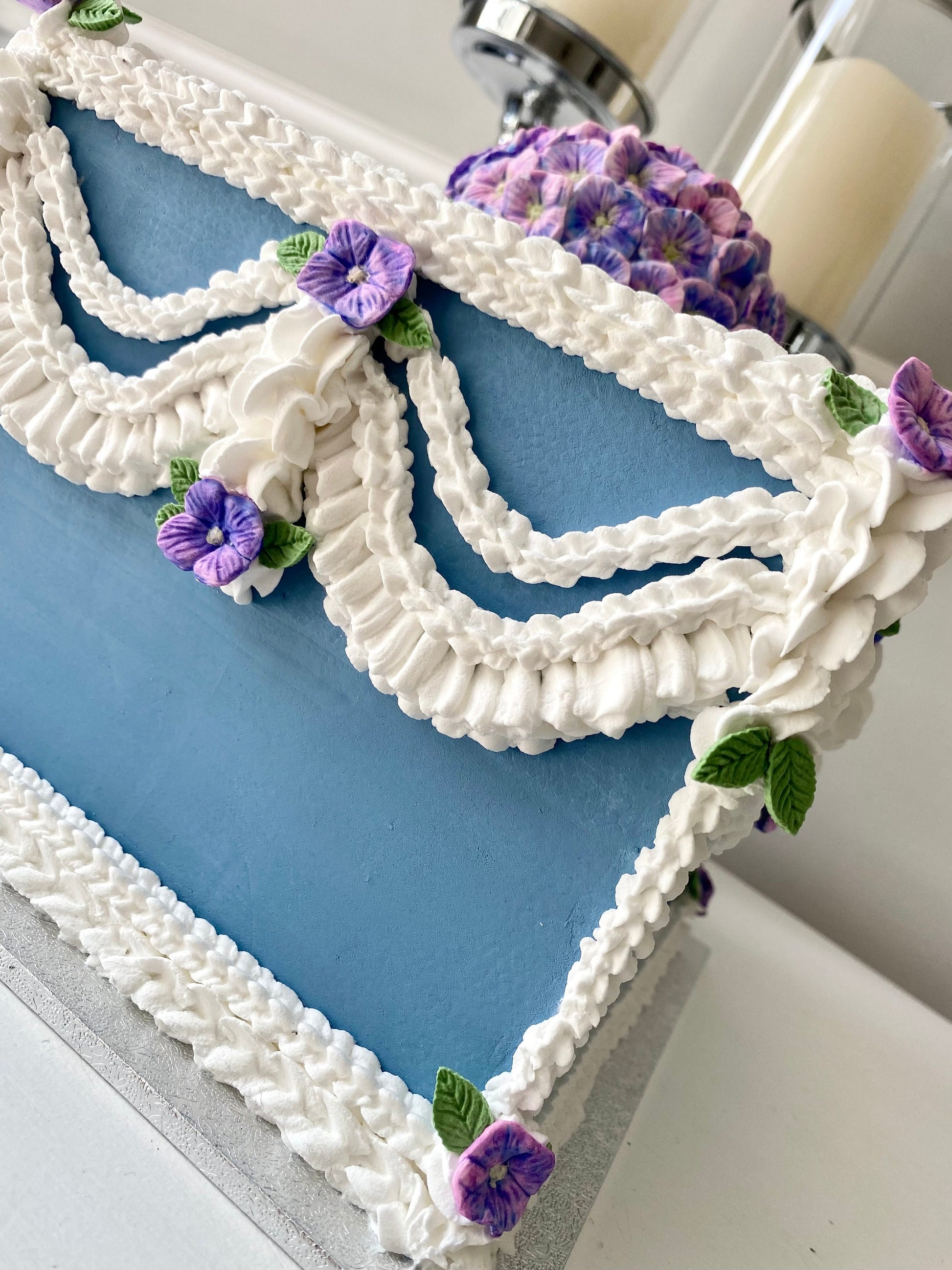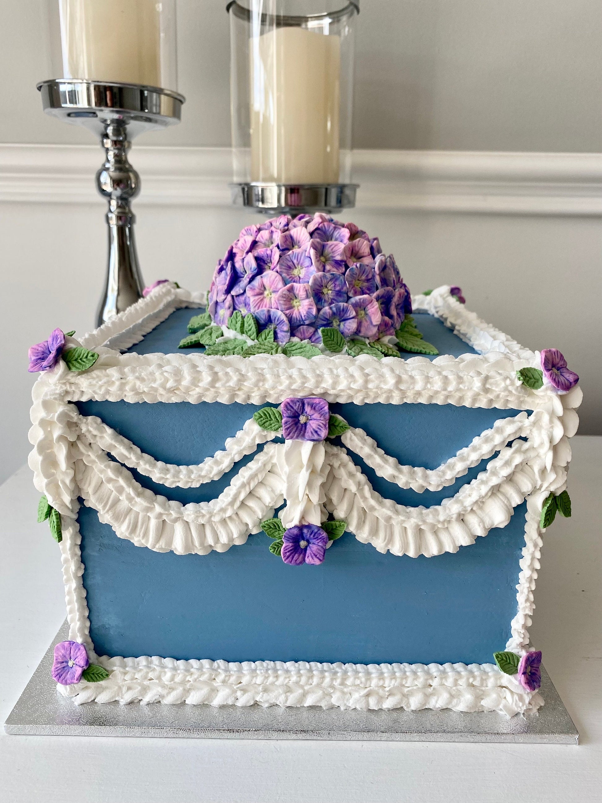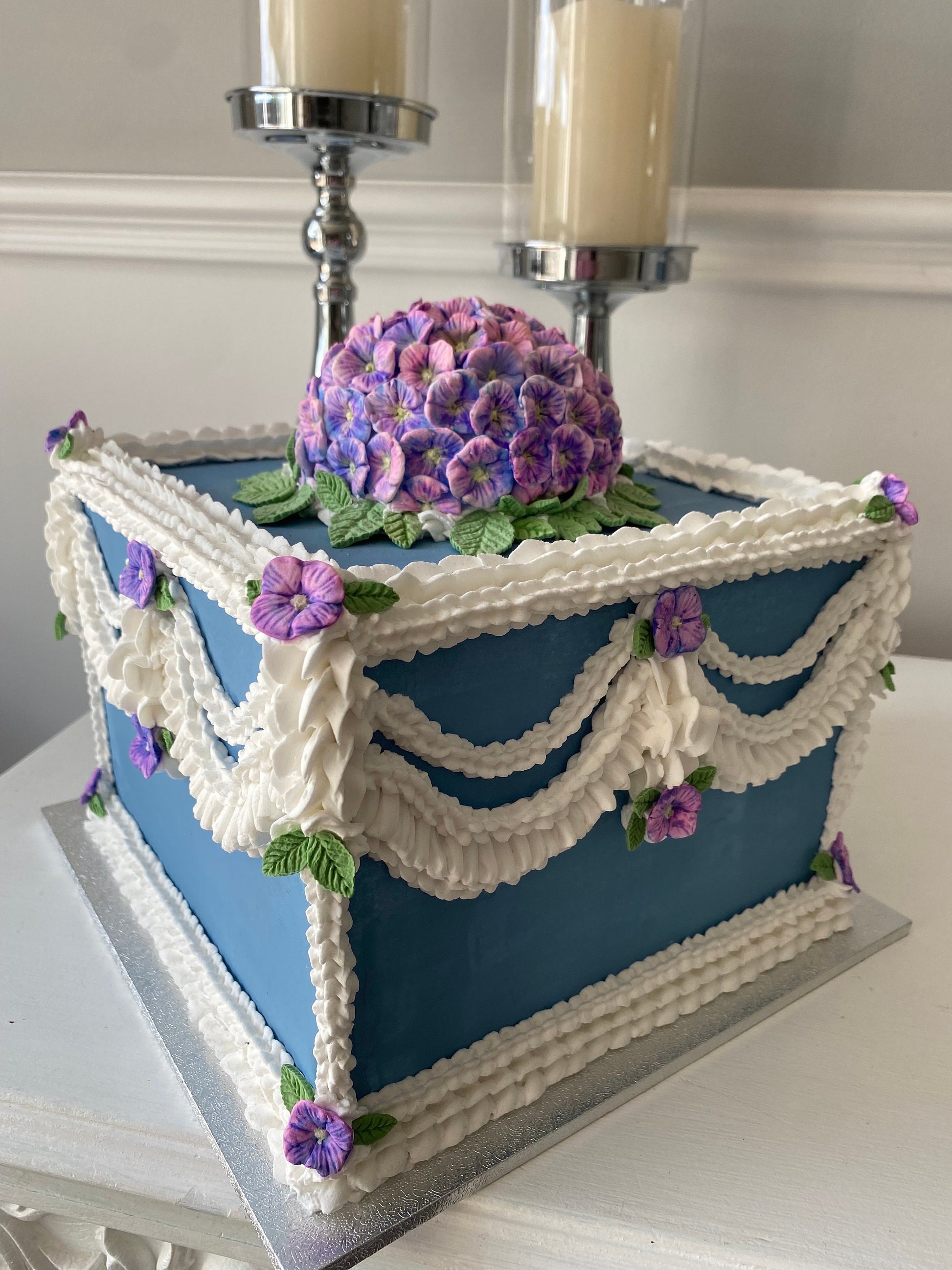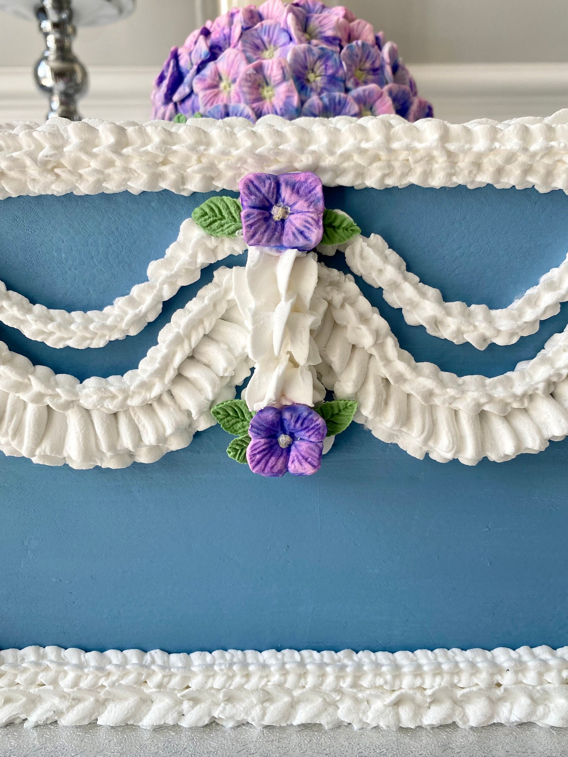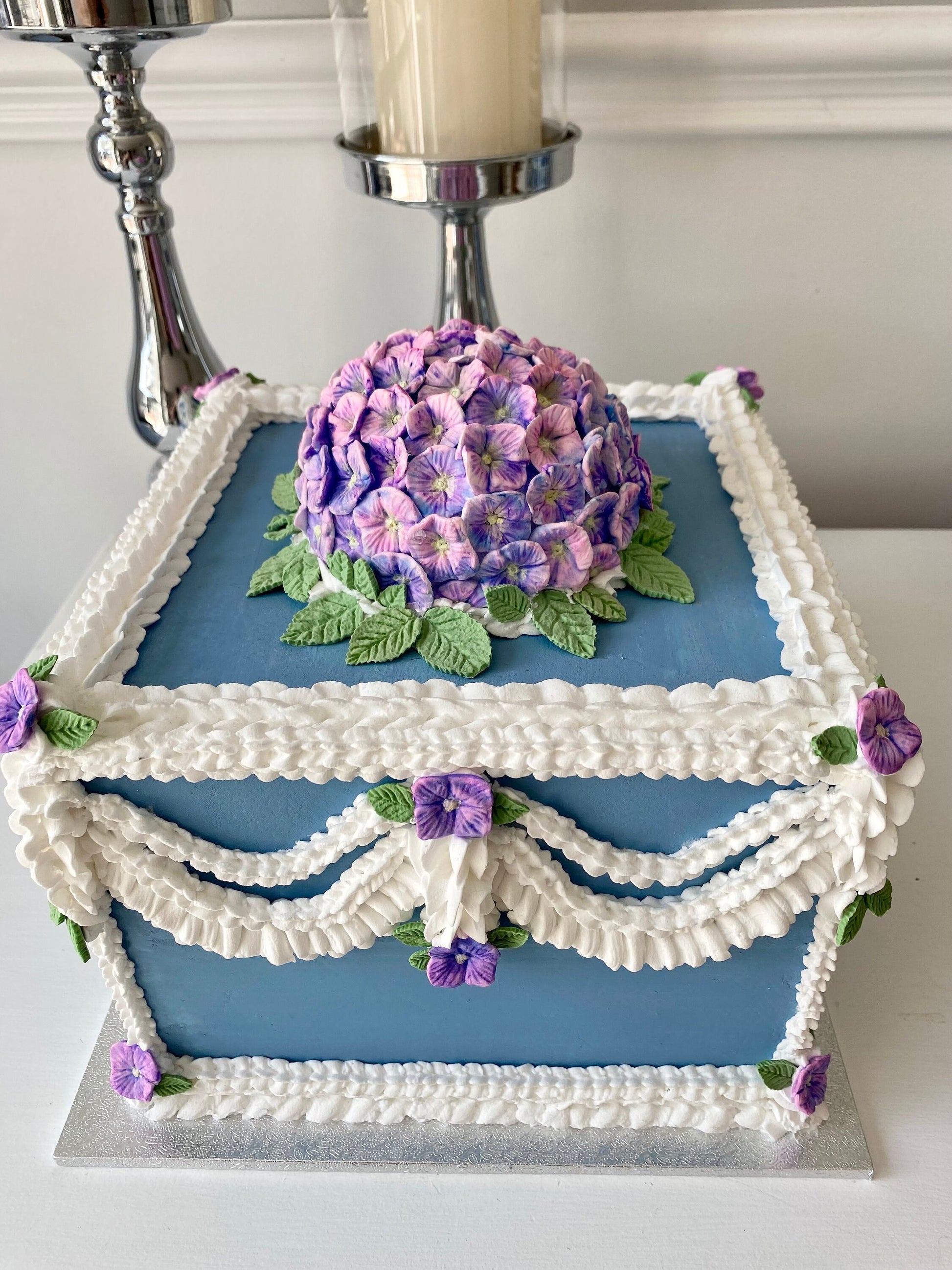 πππ This stunning faux vintage inspired faux cake has been lovingly made. Each hydrangea petal is handmade and hand painted and then piped with faux icing.