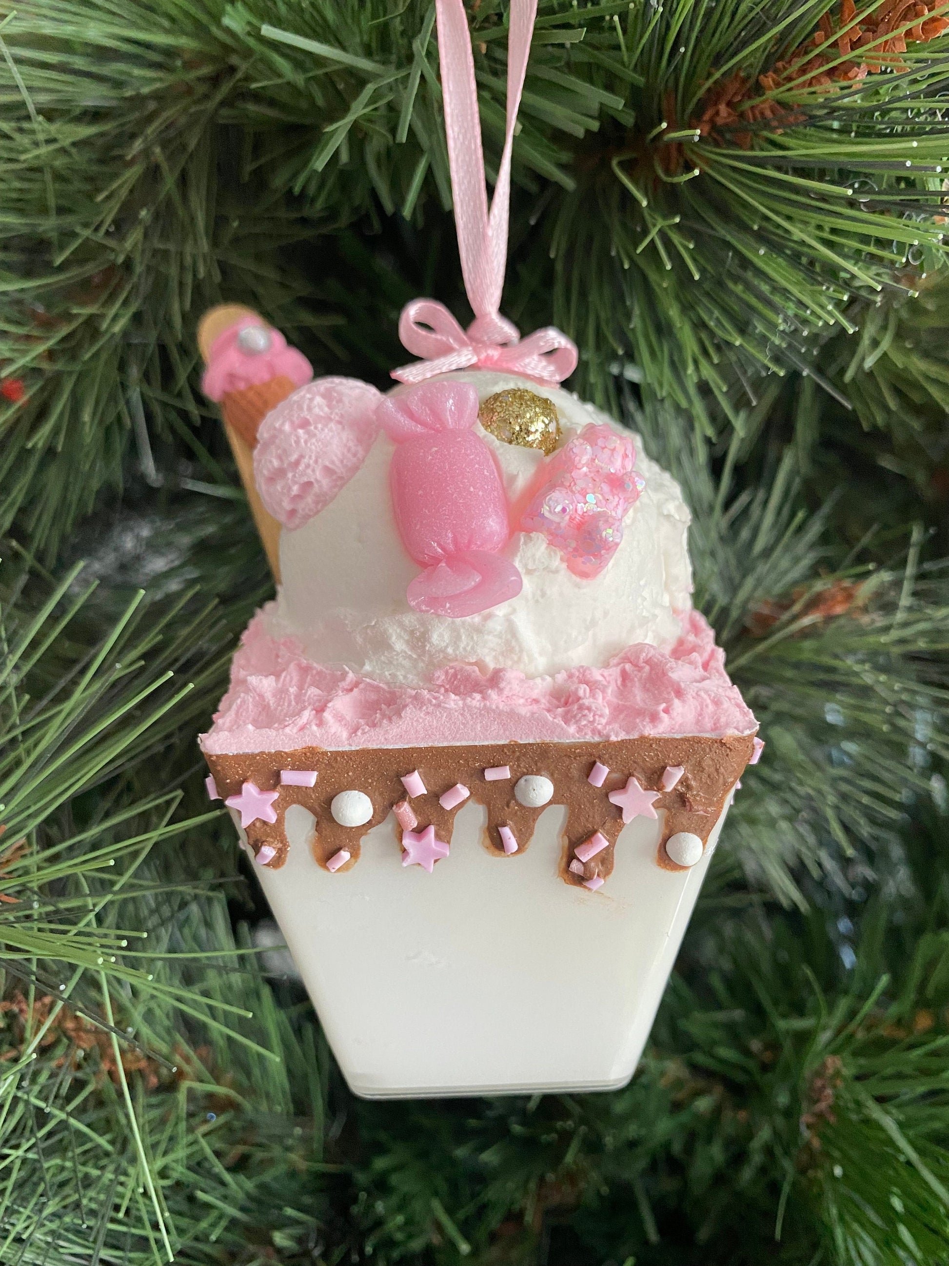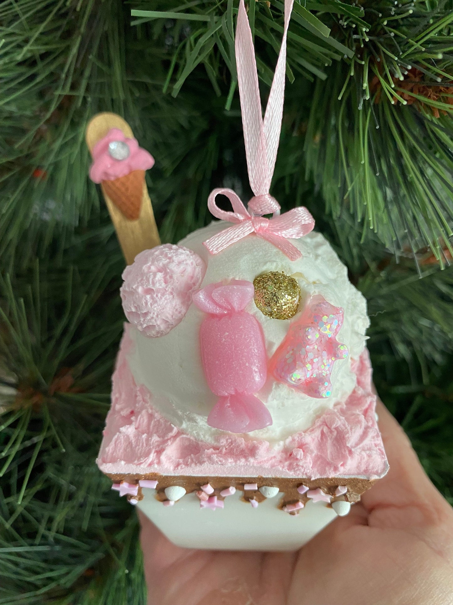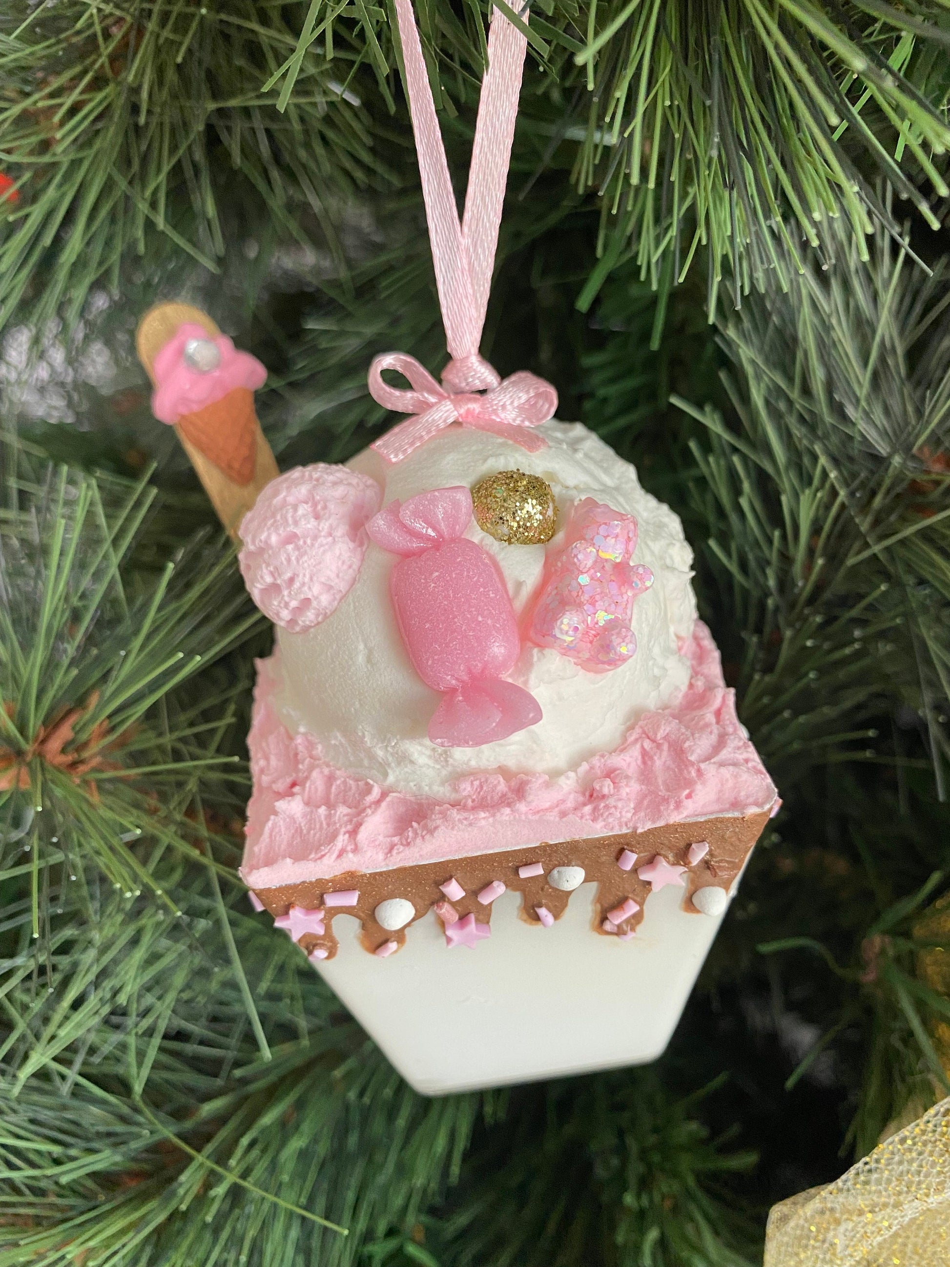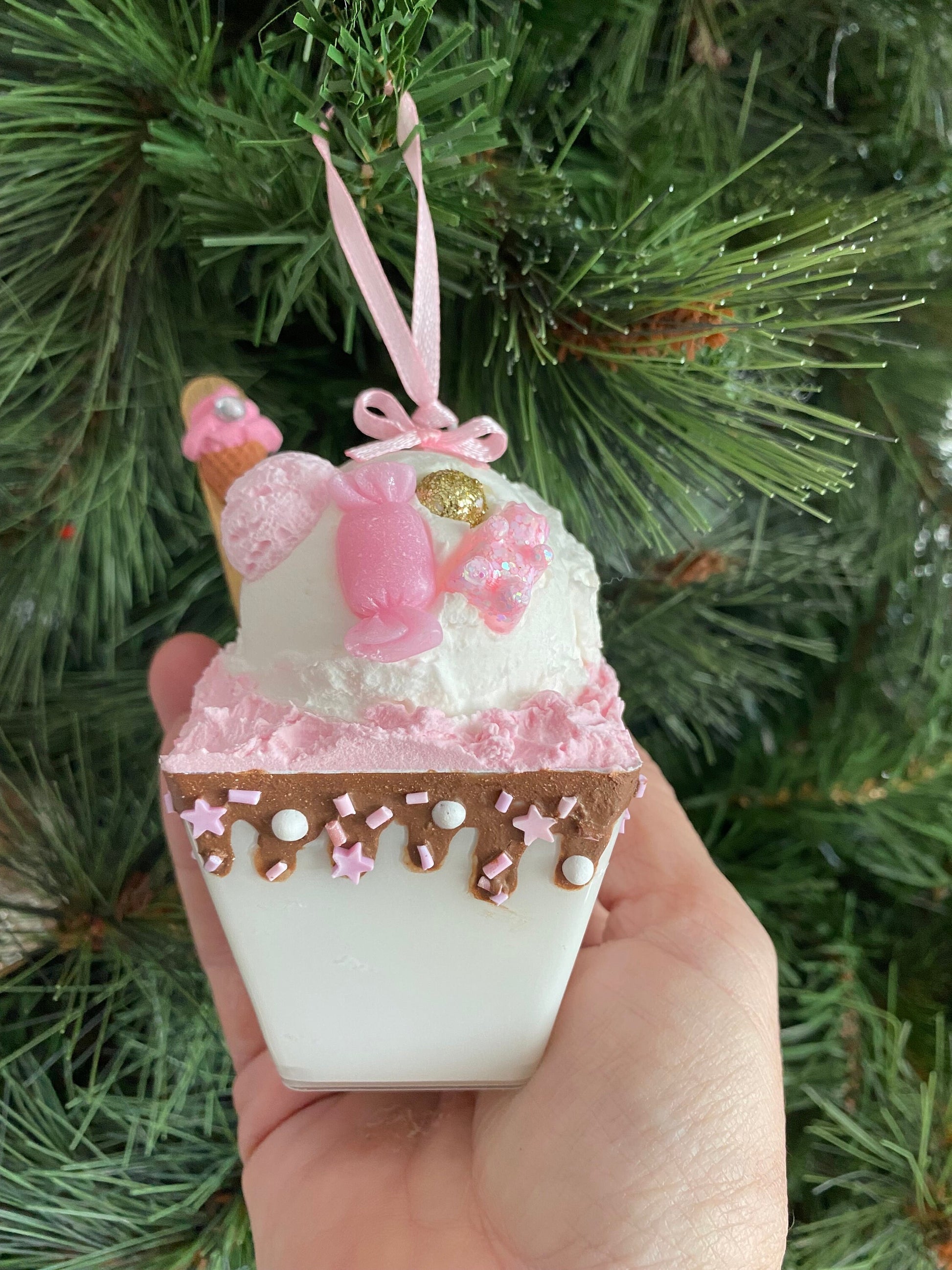 🍨 Handmade Pink Ice Cream Ornament – Whimsical Candy Christmas Tree Décor 🎀