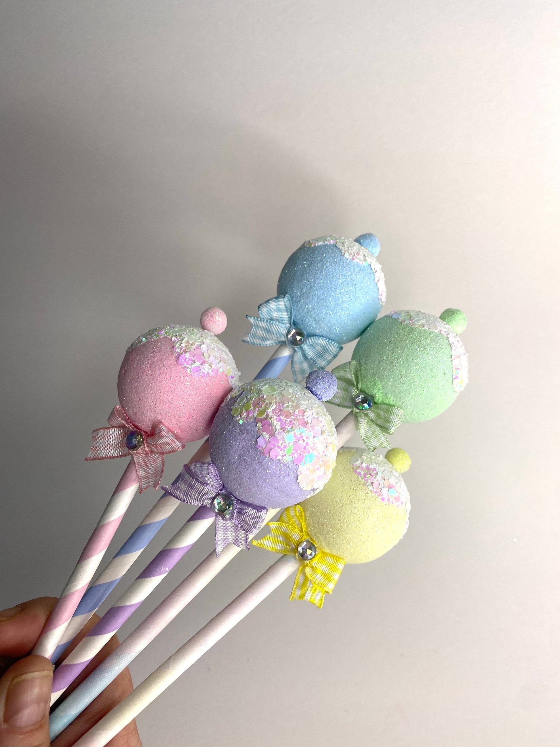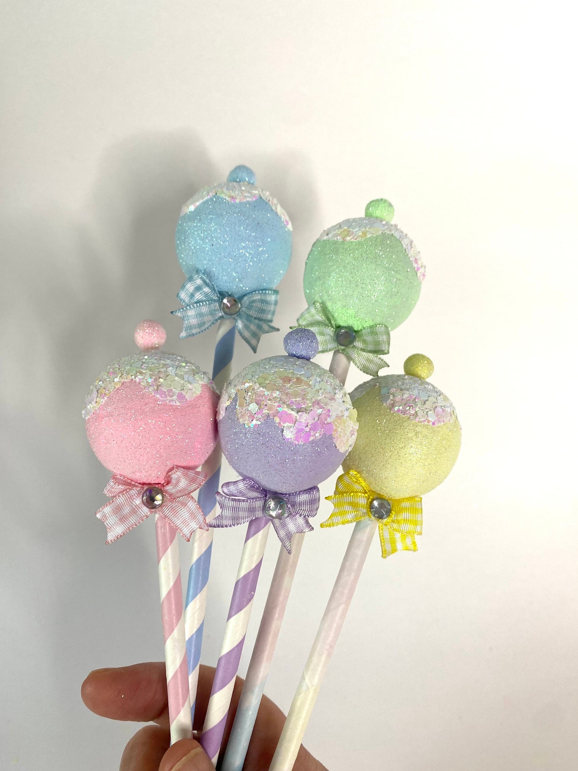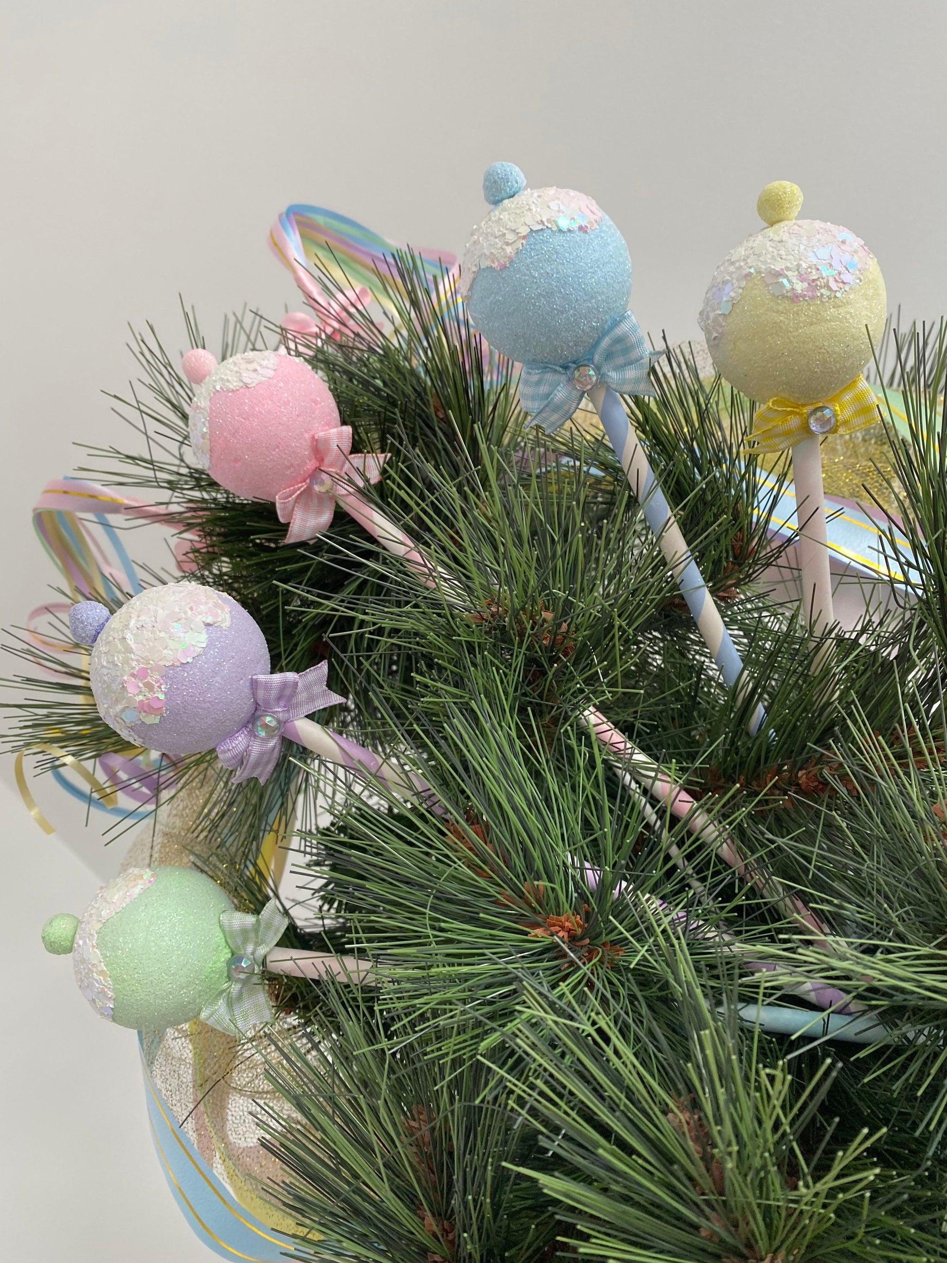 Available in soft pastel pink, blue, green, yellow, and purple, each faux lollipop is handcrafted with care and designed to add a playful pop to any display. Use them as Christmas picks, candy party props, or even as part of a show-stopping centrepiece!